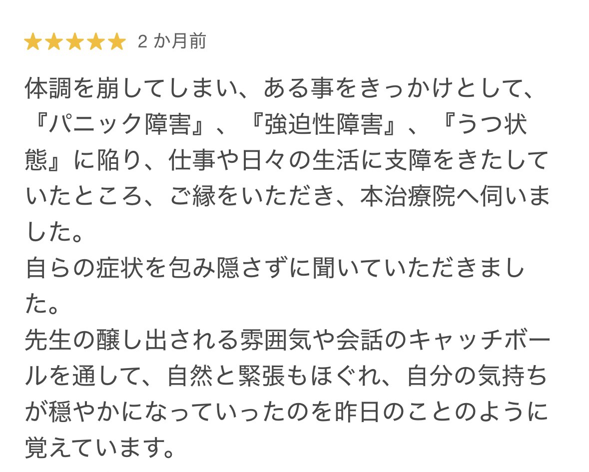 実際には、当初のつらさがなくなったり、社会復帰できた段階で治療を終える方もいれば、月に1〜2回のメンテナンス通院を希望される方もいらっしゃいます。