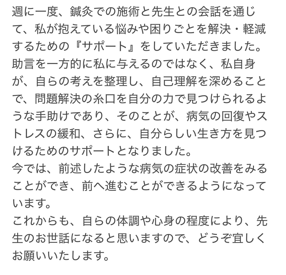 そのため、症状の改善だけでなく、再発を防ぎやすい体質づくりや、生活の中で実践できるセルフケアもお伝えしています。