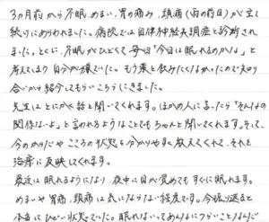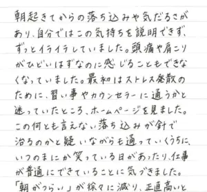 朝起きてからの落ち込みや気だるさがあり、自分ではこの気持ちを説明できず、ずっとイライラしていました。頭痛や肩こりがひどいはずなのに感じることもできなくなっていました。