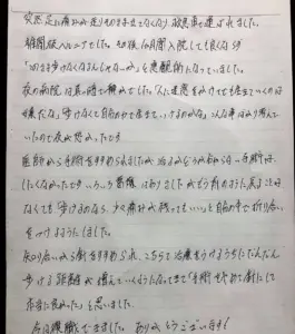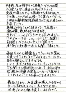 不眠の日が減っていき、家で笑顔の日が増えました。同じ生活の中でも感じ方が変わり、心の余裕がでてきたように思えます。