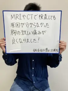 MRIやCTでも異常が見つからず、不安だった激しい胸の痛みが消え、今は安心して会社に通っています
