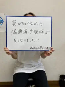 偏頭痛は1回目の針でだいぶんマシになって、何回かしていただいて天気が曇りでも頭痛はなくなりました。生理痛は通うたびに本当に良くなってきて、ほとんど薬を飲まなくなりました。